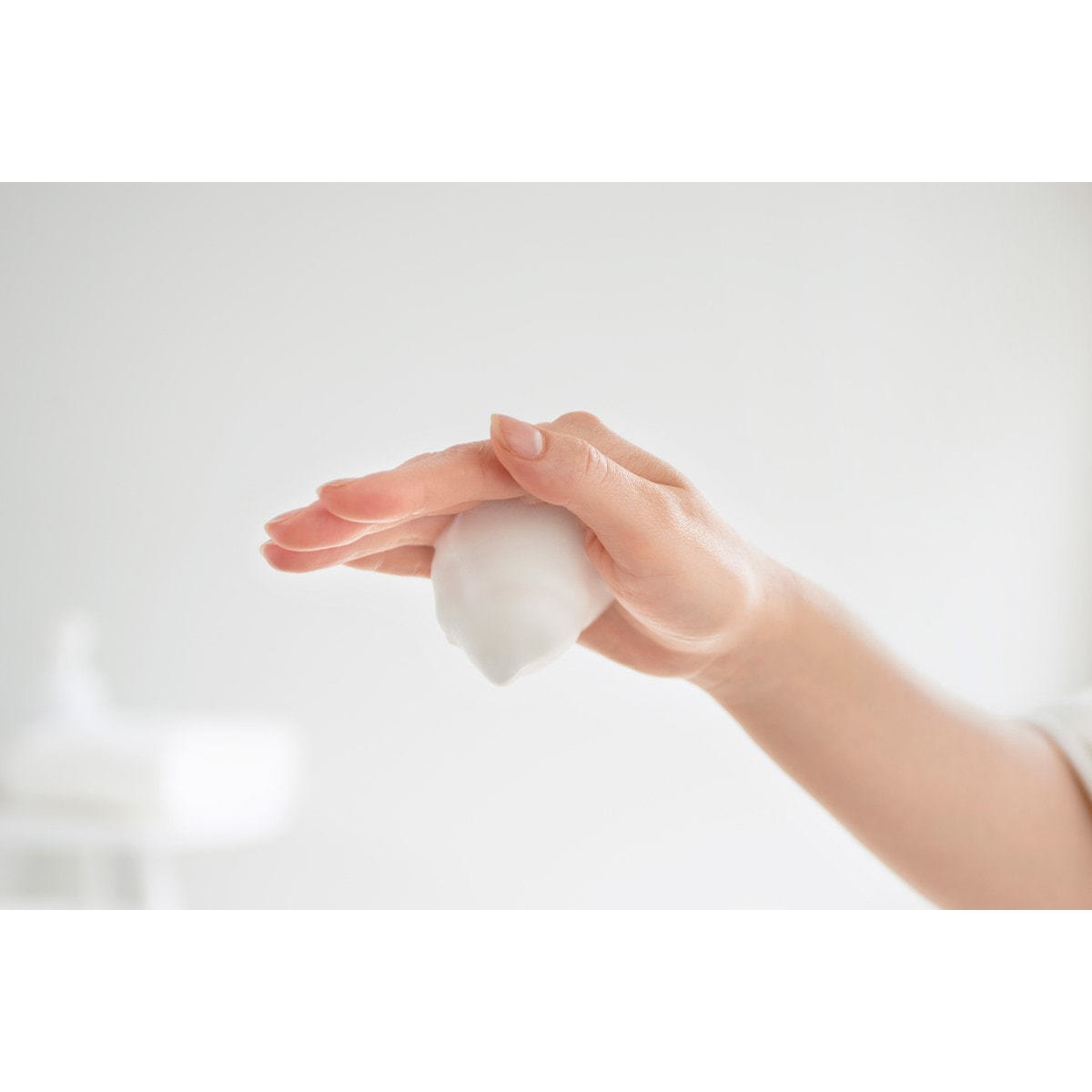 肌を軽く濡らし、2~3プッシュ分の泡を手に取り、優しく洗ってください。